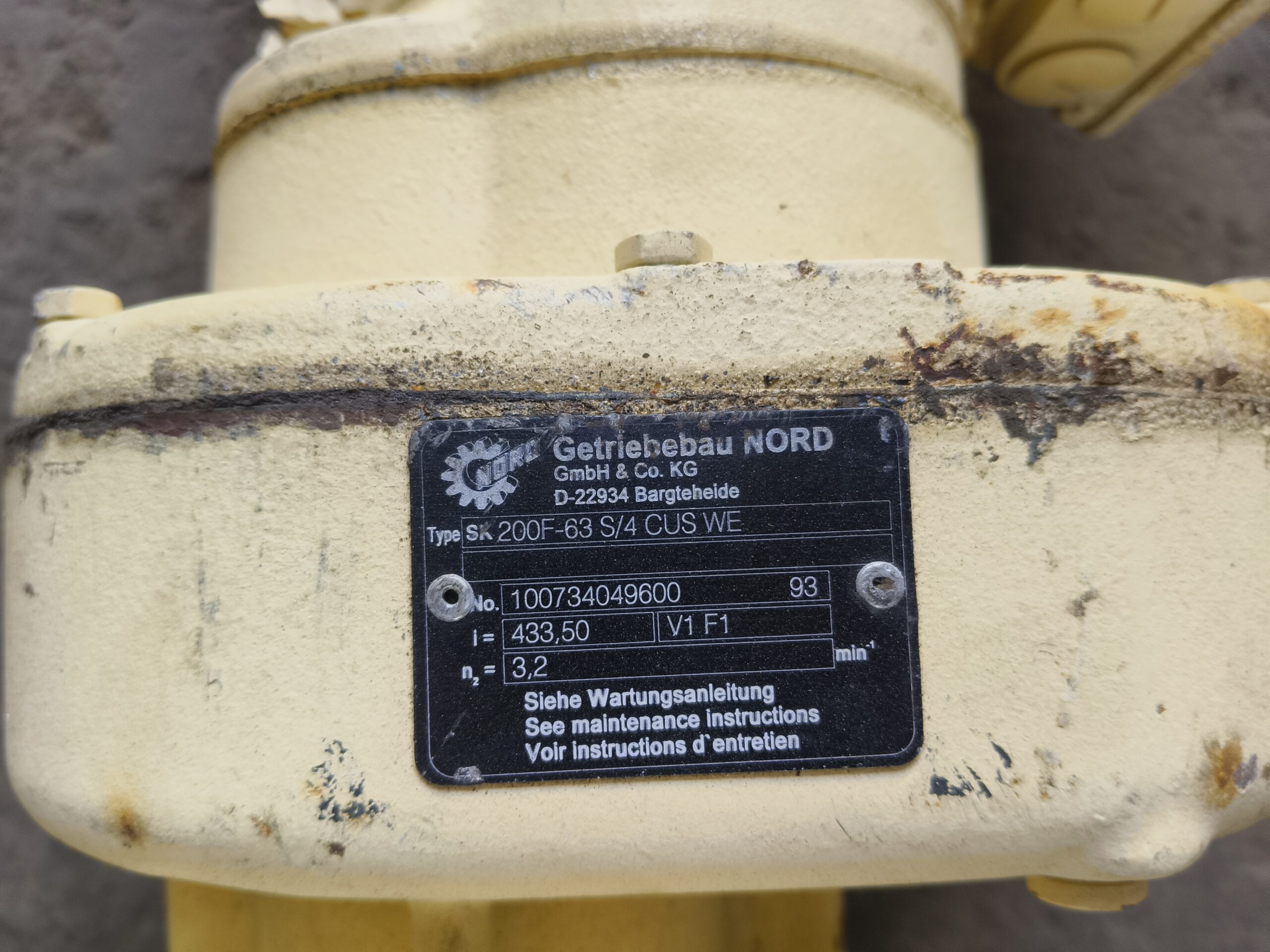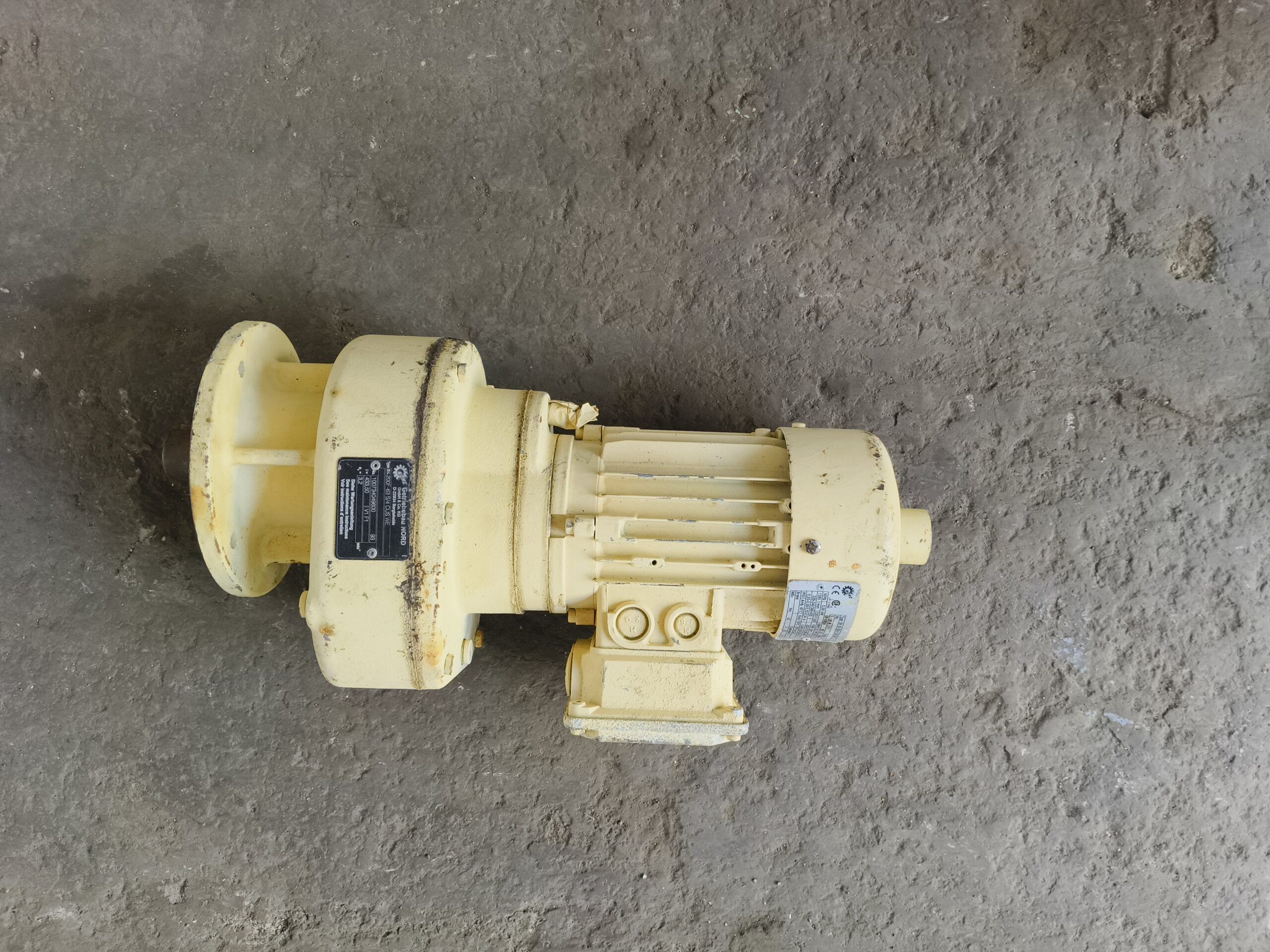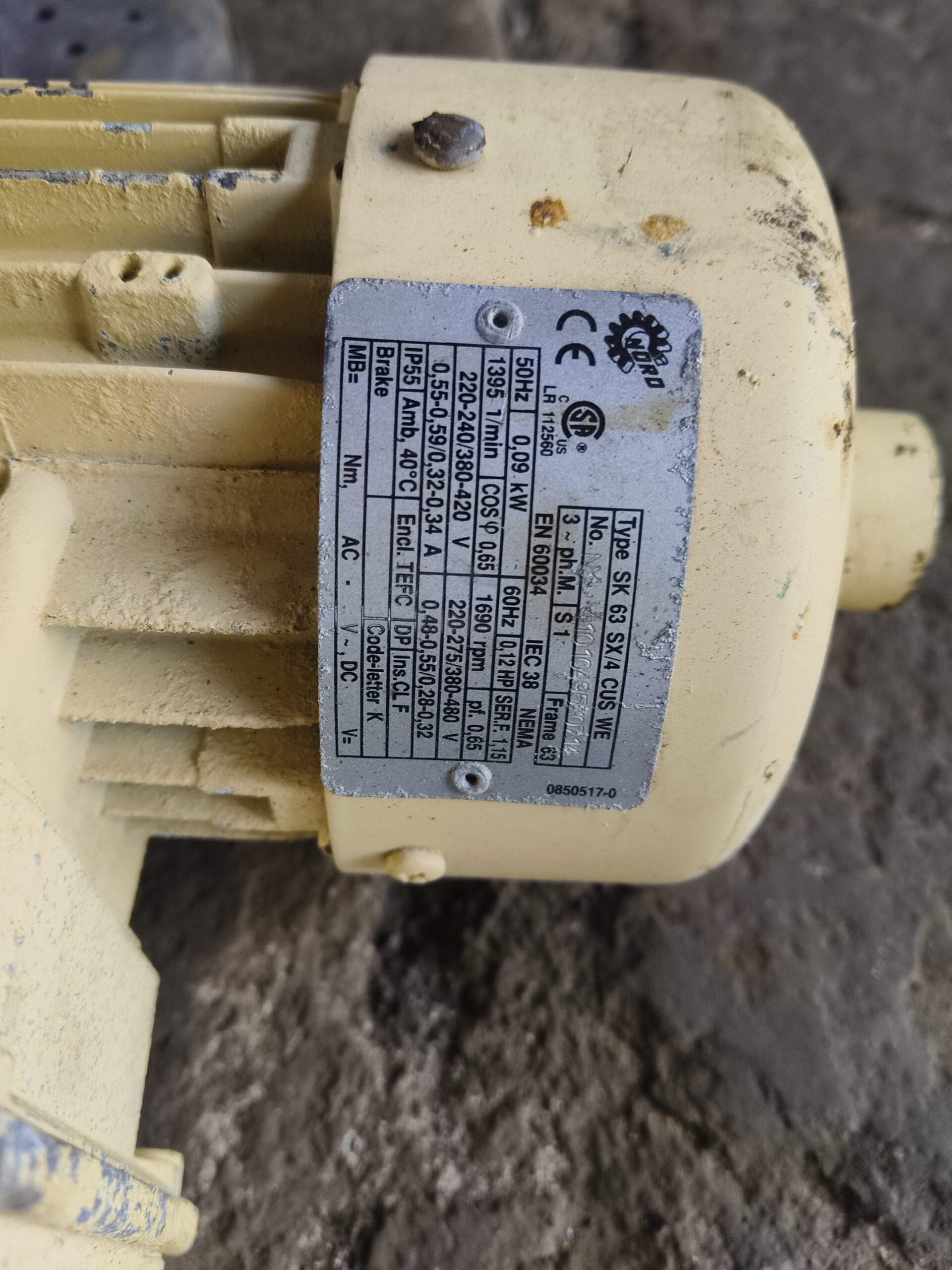 0.25 hp 3 Rpm gear motor. Type SK 200F-63 S/4 CUS WE,RATIO=433.50, suitable for marine and industrial application. make by nord. made in germany.