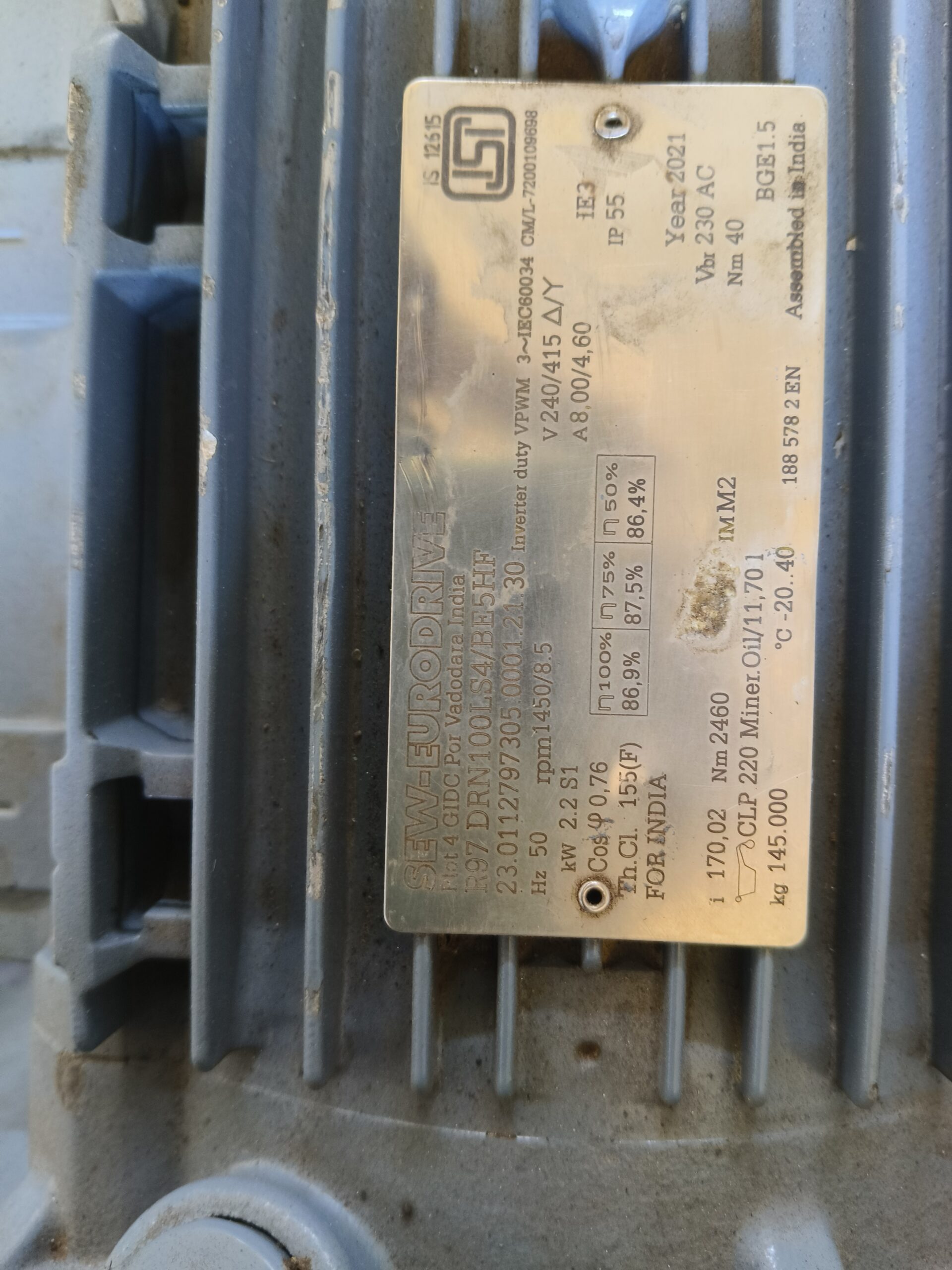 SEW-EURODRIVE 3 HP Heavy duty inline helical gear motor with break. suitable for marine and heavy industrial applications. Motor type DRN100L4/BE5HR, Power rating 2.2 KW(3HP) , 50hz,Voltage 220/415 V, Protaction class IP 55. Engineered for heaavy duty performance in demanding marine and industrial application, ensuring stable opration,high torque output and long service life.