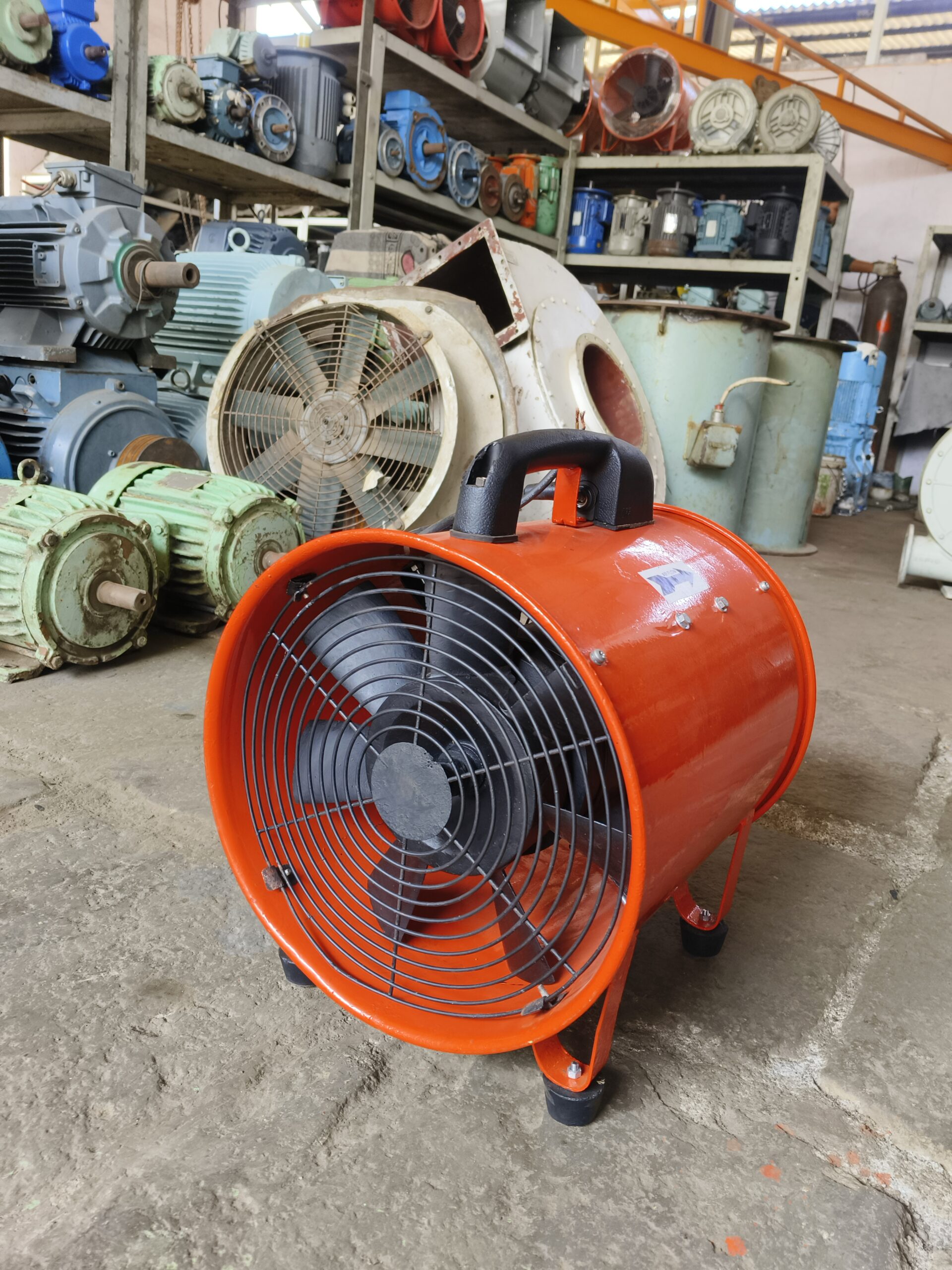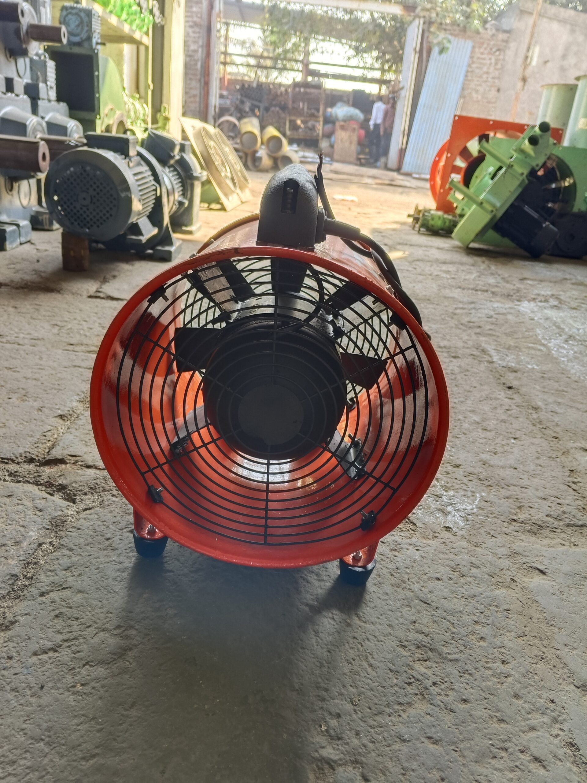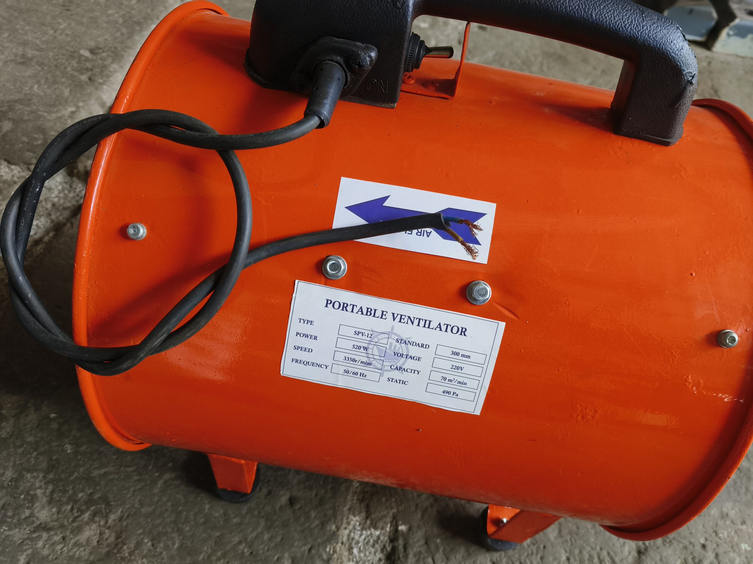 This portable exhust fan is model SPV-12 with a fan size of 300 mm. it oprate on 220 voltage power supply with 50/60 hz. it runs at speed of 3350 rpm.tha fan delivers an air capacity of 70m3/min and provide a static pressure of 490 pa. making it suitable for effective vantilation in industrial and commercial applications.